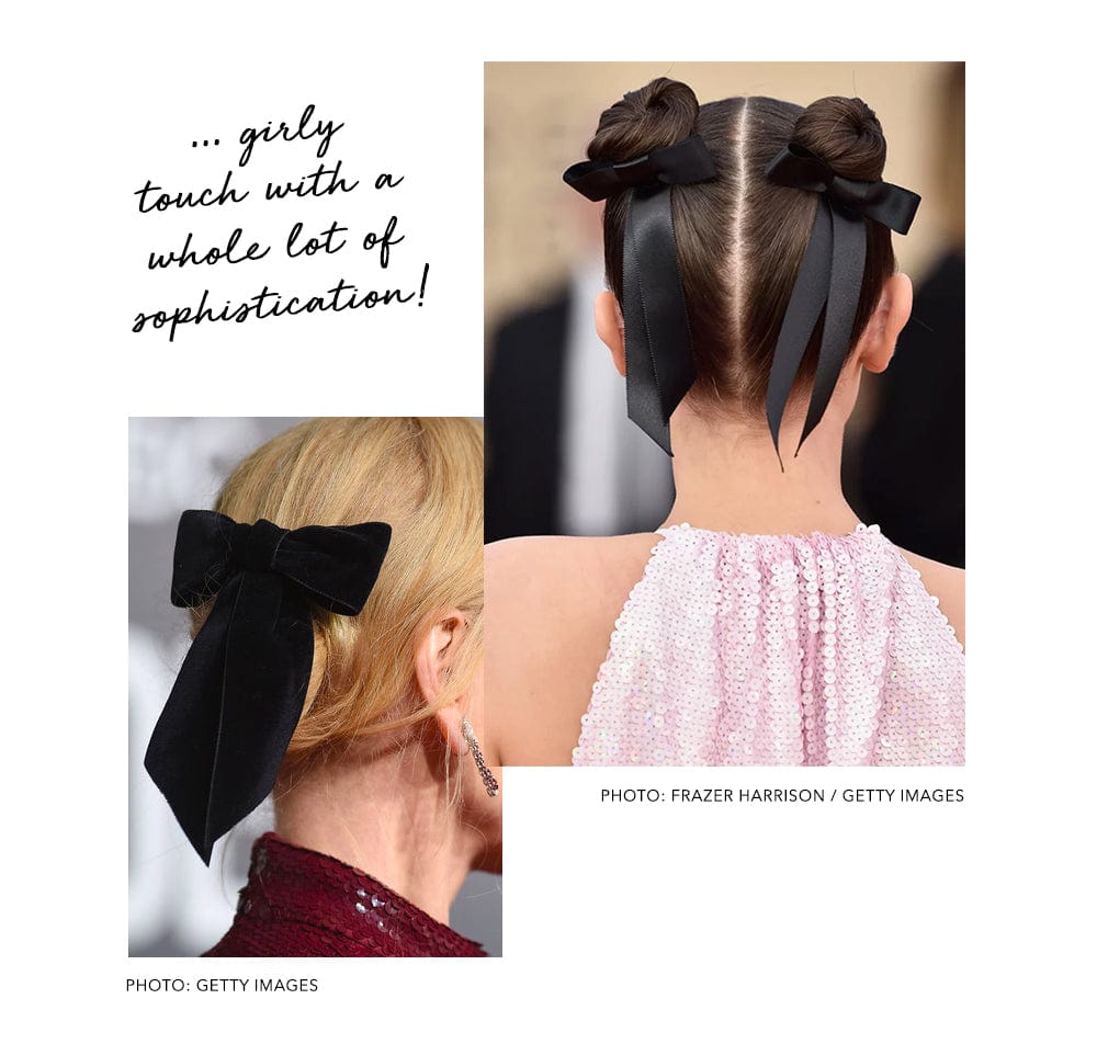 What are celebrities LOVING this season…? Bows, bows and more bows! While they may seem like a simple addition to a look, a single, double or multitude of bows can boost an outfit from 0 to 100…REAL QUICK. Just look at massive babe Bobby-Brown who doubled up on these gorgeous black, silk bows! The ‘Stranger Things’ star wrapped the bows around two space buns, adding a lovely girly touch with a whole-lot of sophistication. To recreate this look, you can add our ‘Brown Leopard Hair Bow Tie’ to a high pony or bun like Millie!